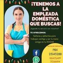 Puede ser una imagen de 1 persona y texto que dice "¡TENEMOS A LA EMPLEADA DOMÉSTICA QUE BUSCAS! ¡Agenda tu servicio con nosotros! TE OFRECEMOS: Señoras señoritas para trabajar contigo ser tu mano amiga en tu HOGAR DATOS DE CONTACTO: f B PBX 23143288 WHATSAPP 31266494"