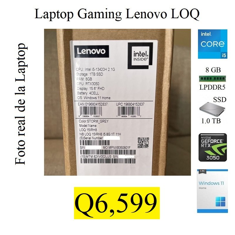 Tengo a la venta Laptop Gamer Lenovo LOQ NUEVA Y SELLADA de fábrica. El precio es fijo y el pago es en efectivo o transferencia únicamente. Con respecto a la entrega No cuento con local físico, pero entrego personalmente sin costo en colonia ubicada en zona 7 o algún centro comercial cercano para la seguridad de ambos. La laptop LENOVO cuenta con las siguientes Características:
