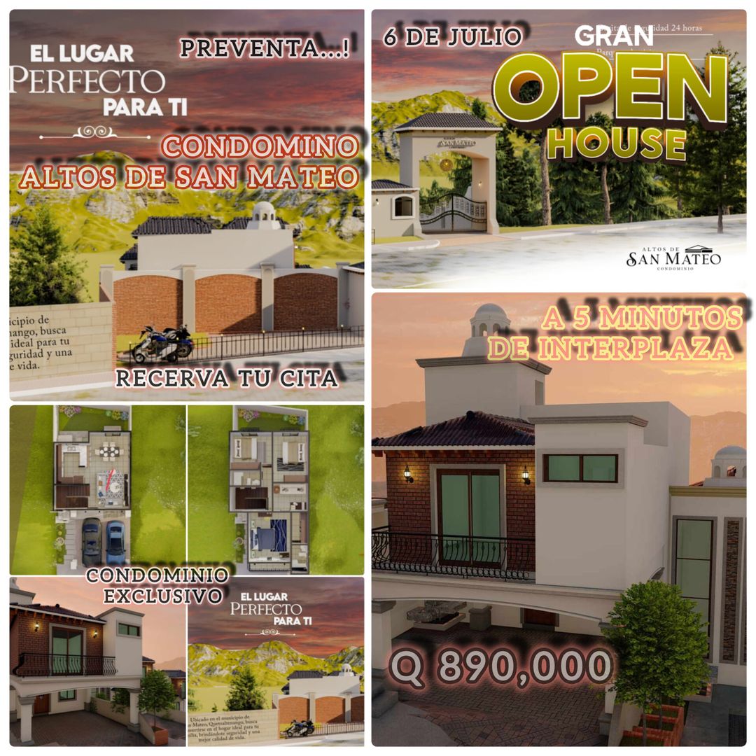 Preciosa casa en condominio Altos de San Mateo a solo 890,000 precio de preventa más información WhatsApp 3567 1660 te esperamos en nuestro gran Open House en donde habrán descuentos precios especiales sorpresas premios y mucho más Ven y conoce el condominio más exclusivo de Quetzaltenango a 5 minutos de interplaza