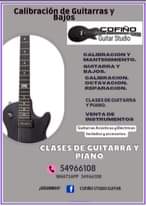 Puede ser una imagen de guitarra y texto que dice "calibración Bajos de Guitarras y COFIÃO Guitar Studio CALIBRACIÓN MANTENIMIENTO. GUITARRAY BAJOS. CALIBRACION. OCTAVACION. REPARACION. CLASESDEGUITARRA ΥΡΙΑΝΟ. 代 VENTADE INSTRUMENTOS Guitarras Acústicas Eléctricas teclados y accesorios. CLASES DE CUITARRA PIANO 54966108 WHATSAPP 54966108 ¡SIGUENOS! f COFIÃO GUITAR"