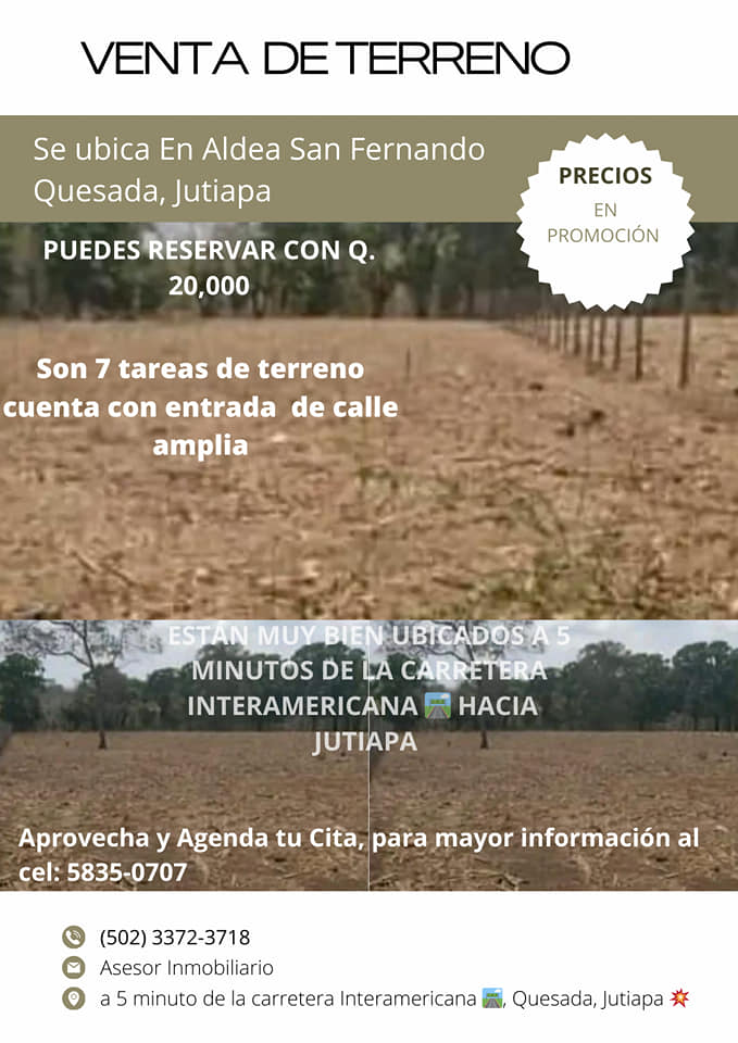 Vendo 7 tareas de terreno a orilla de calle en Aldea San Fernando, Quesada Ter