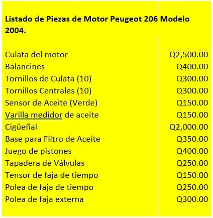 Vendo repuestos para Motor de Peugeot 206, 2004, en buenas condiciones. Whatsapp